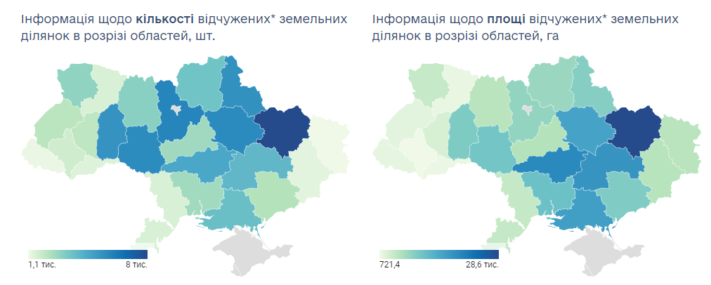 За даними Держгеокадастру, починаючи з 1 липня 2021 року в Україні було відчужено більше 78 тисяч земельних ділянок загальною площею 200 тис. гектарів. Більшість сільськогосподарських земель були передані у власність за договорами купівлі-продажу. Середня вартість за 1 га ділянки становить 38 389 грн.