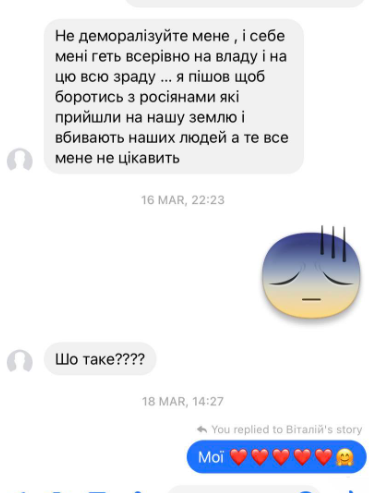 «Не деморалізуйте мене і себе. Я пішов боротись з росіянами, які прийшли на нашу землю і вбивають наших людей. А те все мене не цікавить».