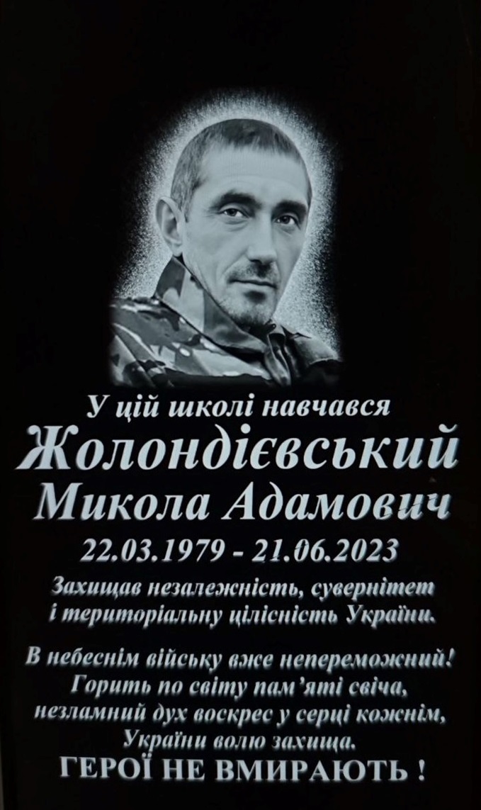 Микола Жолондієвський служив гранатометником у механізованому батальйоні 42-ої окремої механізованої бригади. 44-річного жителя с.Кримне мобілізували до війська у грудні 2022 року. Солдат загинув 21 червня цього року під час оборони наших позицій біля с.Діброва Кремінського району Луганської області, до 8 липня 2023 року вважався зниклим безвісти.
