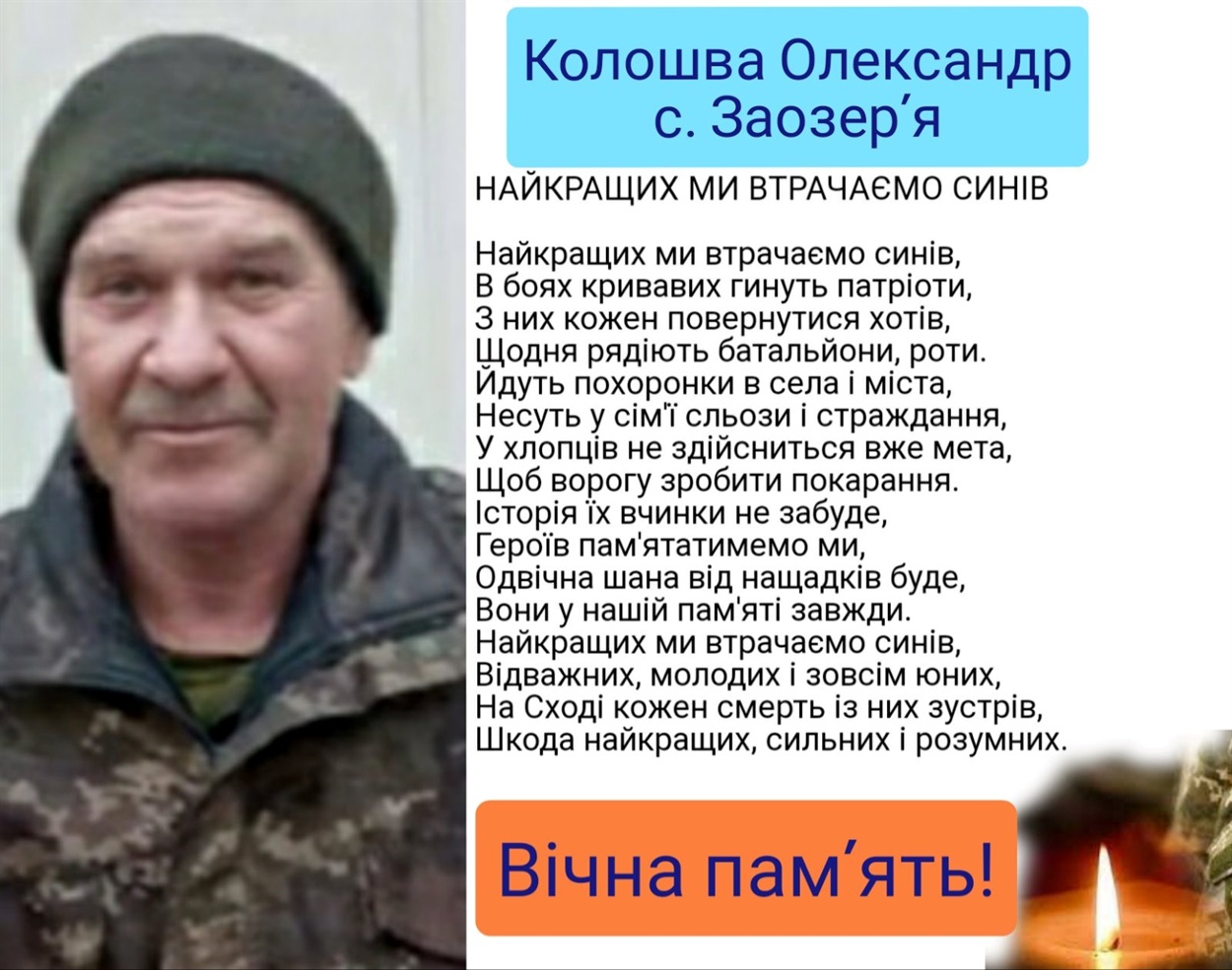 21 січня 2024 року внаслідок тяжкого поранення в ході бою стрілець 3-го стрілкового відділення, 1-го стрілецького взводу, 2-ї стрілецької роти військової частини А7065, солдат Колошва Олександр Васильович, 04.01.1967 року народження, житель с. Заозер'я, Локницької громади помер в стабілізаційному пункті м.Часів Яр після евакуації з поля бою в Бахмутського району, Донецької області.
