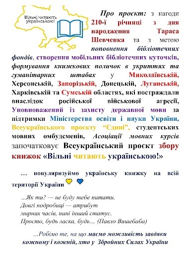 КЗ "Локницька центральна публічно-шкільна бібліотека" долучилась до Всеукраїнського проєкту збору книжок "Вільні читають українською!", з нагоди відзначення 210-ї річниці з дня народження Тараса Шевченка та з метою поповнення бібліотечних фондів, створення мобільних бібліотечних куточків, формування книжкових поличок в укриттях та гуманітарних штабах у Миколаївській, Херсонській, Запорізькій, Донецькій, Луганській, Харківській та Сумській областях, які постраждали внаслідок російської військової агресії.