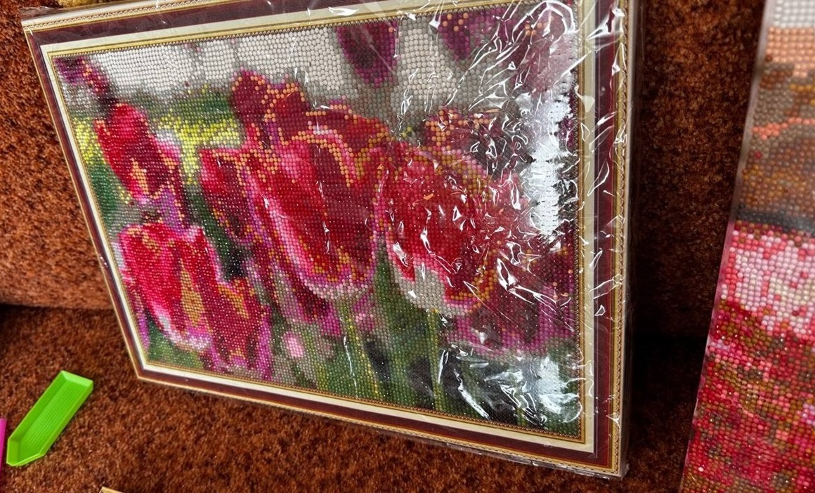 Рідні їй купують заготовки і вони може цілими днями сидіти і викладати візерунки. Робота ця марудна – міліметрові камінці треба на полотні клеїти за номерами кольору, а кольорів – кількадесят. В середньому на картину йде місяць.