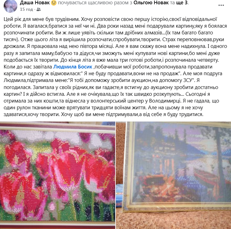 В розмові з родиною запропонувала спробувати реалізувати просту, але важливу ідею: продати картини, а виручені кошти спрямувати на підтримку місцевих волонтерів, які підтримують земляків в Збройних Силах України.
