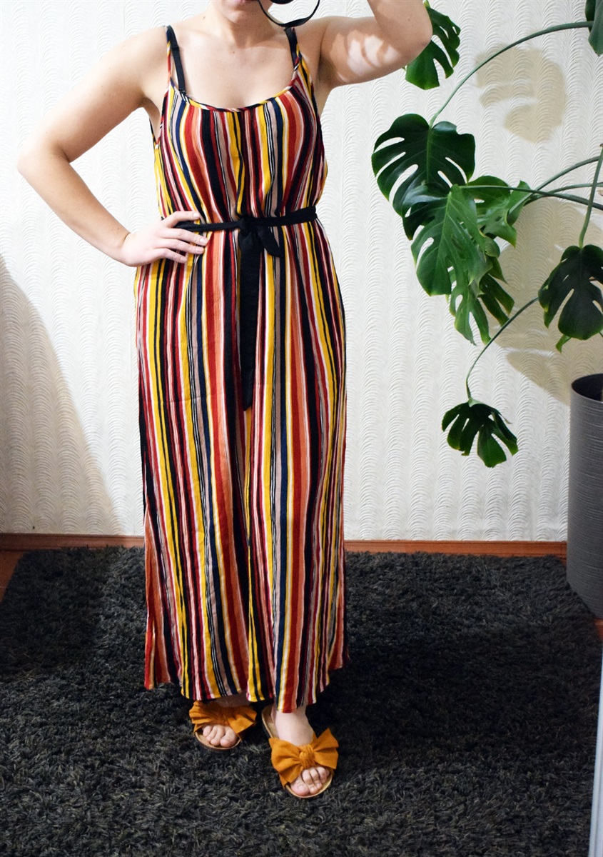 Інший варіант - більш легке плаття, також у смужку, не менш актуальне. Обійшлось воно в 45 гривень. Підкреслити його можна ремінцем (коштував він 7 гривень), і доречними тут (плаття має чорні смужки) класичними чорними босоніжками - у кожної жінки, напевно, в закапелках відшукається таке базове взуття.