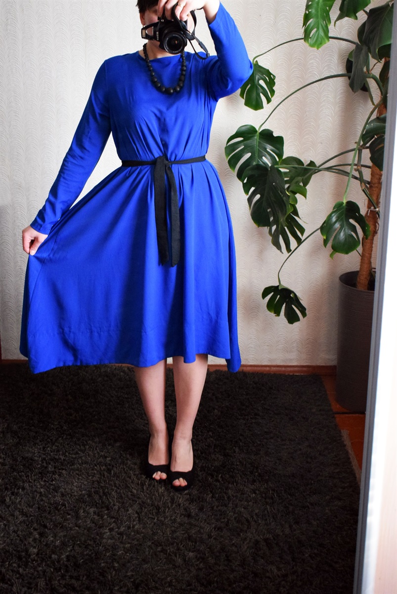 Елегантне плаття А-силуету насиченого кольору кобальт висіло до останніх дешевих днів, бо відшите маловідомим брендом і знизу на подолі мало кілька плям. Тканина тонка цупка шовковиста, різновид крепу – дозволяє гратись із плямовивідниками.