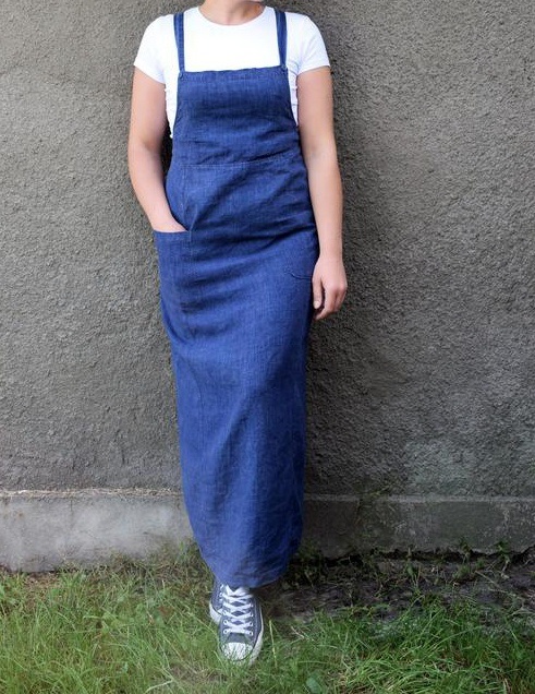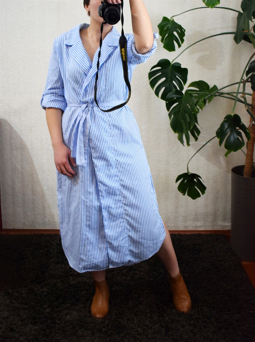 Небесно-блакитна смужка не змогла мене лишити байдужою і в голові одразу виник план, як його перешити. Кілька безсонних ночей і я мала ексклюзивне плаття на запах у довжині міді за 43 гривні.