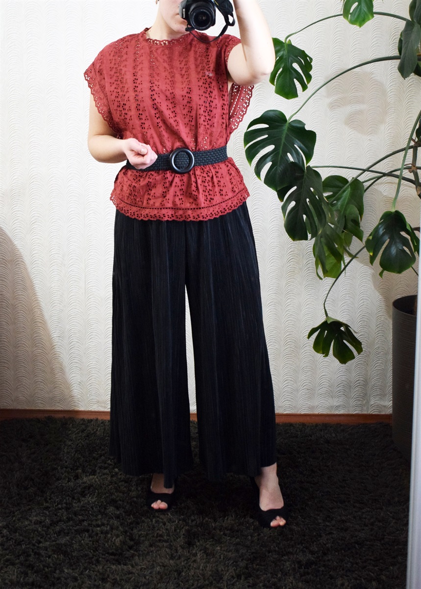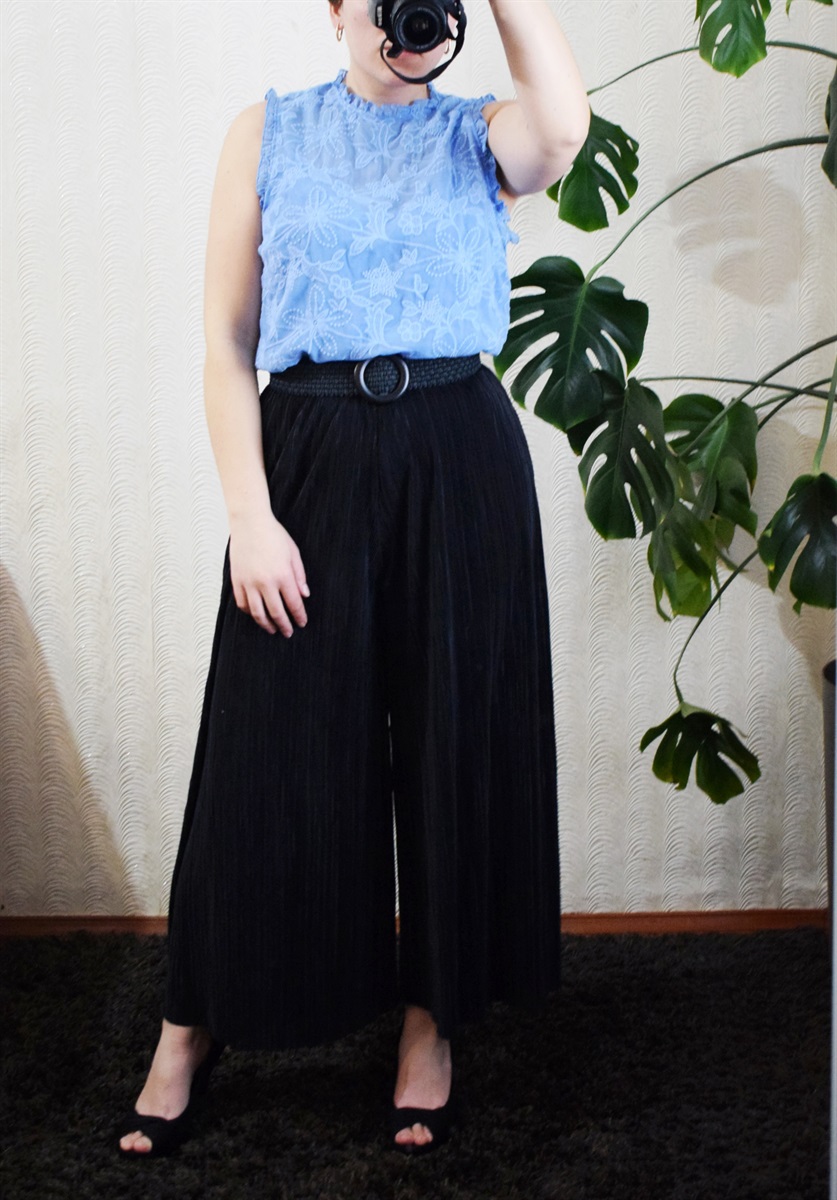 Брюки палаццо – тренд сезону, активно увійшли в моду восени 2019 року. Чорні легкі брюки плісе Topshop придбала в перші дні оновлення товару у магазині торгівлі одягом на вагу за 57 гривень. Для зразку – дві блузи, придбані також в перші дні: теракотова котонова з вишивкою Primark – нова з біркою, заважила 35 гривень, блакитна шифонова з вишивкою заважила 41 гривню. Додала свій пояс і своє взуття. Вартість вбрання - 92/98 гривень.