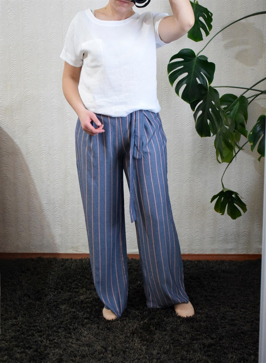 Для прогулянок і на щодень – льняна нова топ-блуза з кишенькою від Marks & Spencer обійшлась у 34 гривні, брюки Papaya в смужку придбала там же за 53 гривні. Балетки пудрові замшеві H&M придбала новими наприкінці сезону, в останні найдешевші дні, коли одяг коштує 19 гривень за кілограм. Заплатила за них 9 гривень. Образ обійшовся в 96 гривень.